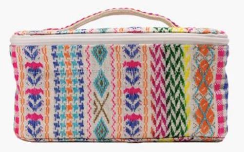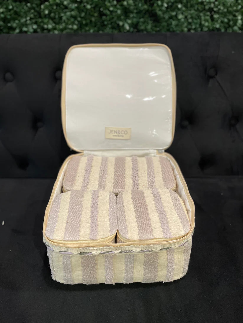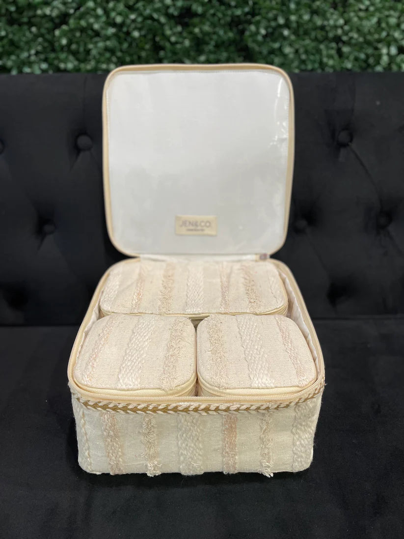 The Fiona Cotton Makeup/Travel organizational case with wide zipper opening and three small inner zip cases. Inner lined with clear PVC for easy cleaning.