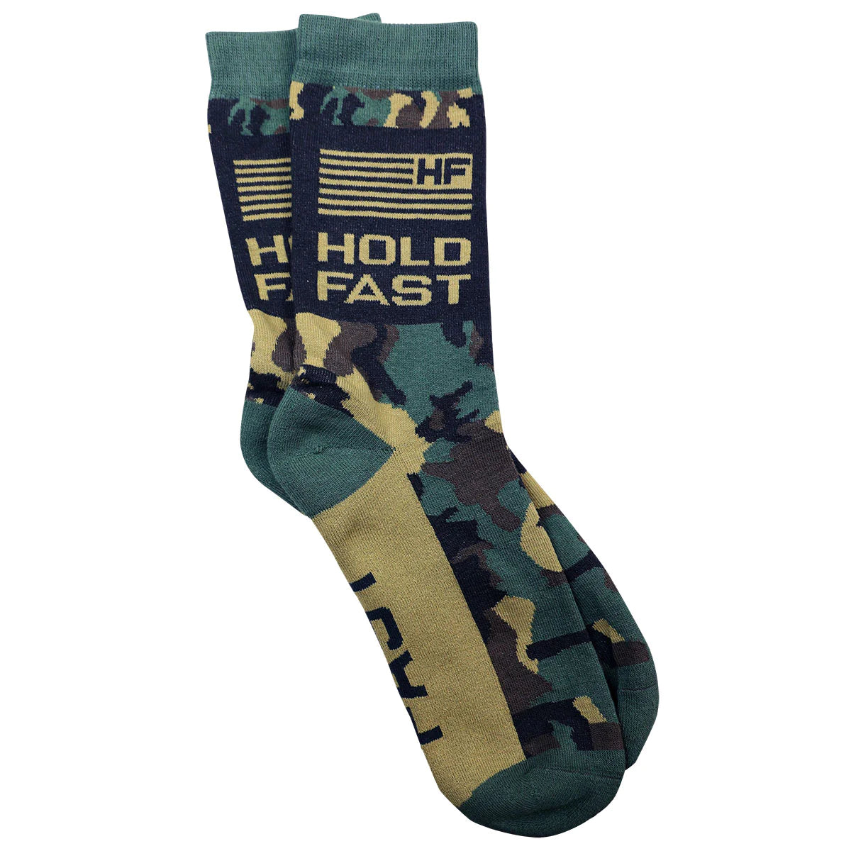 Hold fast to your values and stand up for your beliefs in these rugged “Camo Flag” Socks by HOLD FAST®. You know what you stand for, and you aren’t afraid to show it. Inspire your family, friends, and neighbors to look to you as an example of faith in our nation, and in the Lord. Premium Men’s Hold Fast Crew Socks feature the fit + function guys need, with extra padding in the sole to alleviate foot fatigue in a breathable cotton blend.