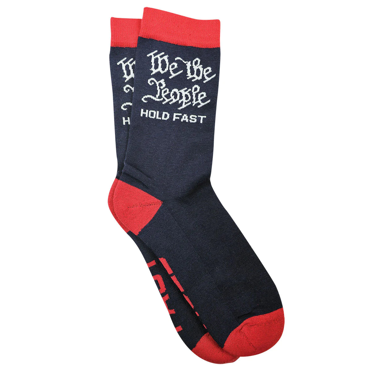 Long may this nation stand! Celebrate what it means to be American in these patriotic “We The People” Socks by HOLD FAST®. The Constitution of the United States of America promotes the blessings of liberty, justice, and tranquility. Premium Men’s Hold Fast Crew Socks feature the fit + function guys need, with extra padding in the sole to alleviate foot fatigue in a breathable cotton blend.
