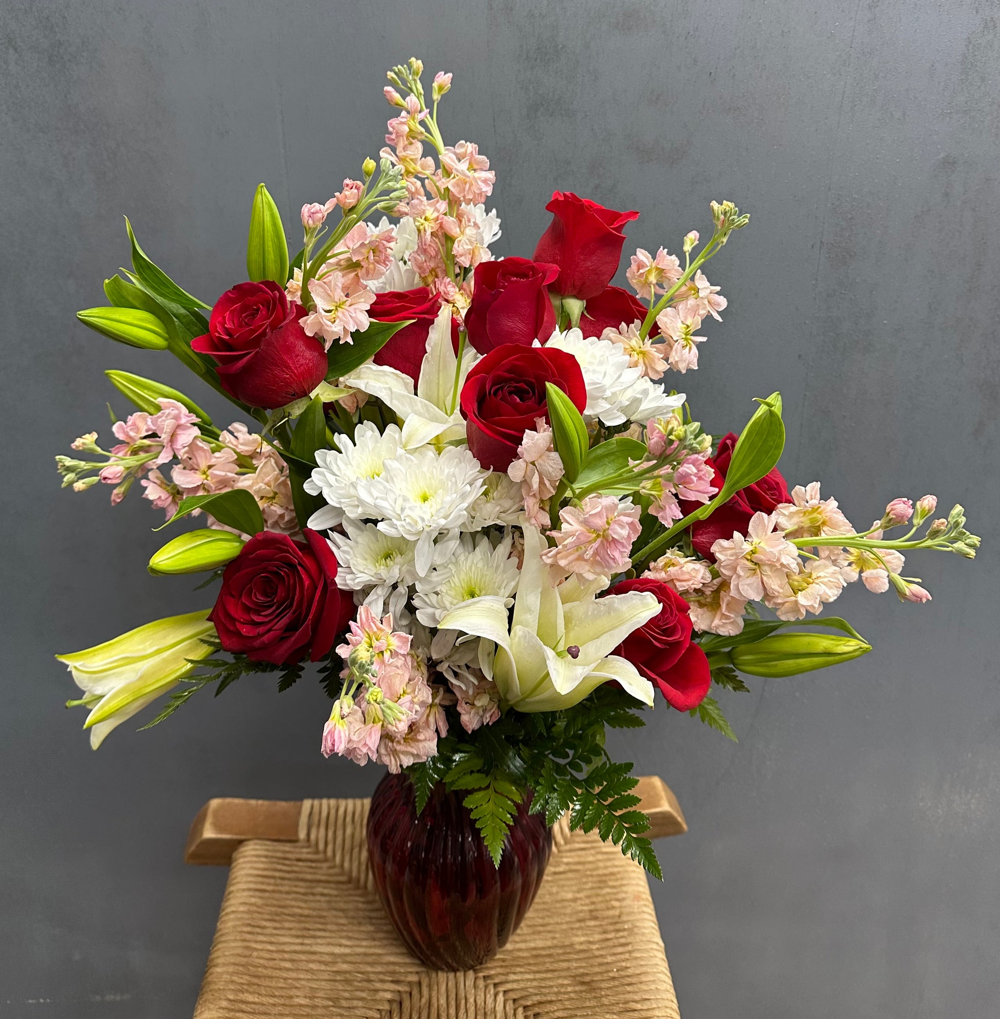 If you are looking to make a statement about your feelings then you are looking in the right spot. Red roses, white lilies, and pink stock are arranged delicately in this bouquet, sure to entice a smile to your loved ones face.