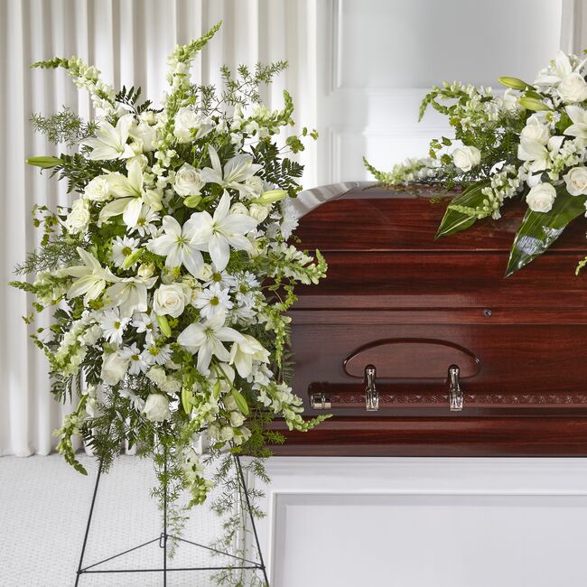 Our Loving Thoughts Standing Spray beautifully captures the message you want to send during times of sensitivity. Crafted with classic, statement white and ivory blooms like lilies, roses and snapdragons, this arrangement is the perfect expression of respect.