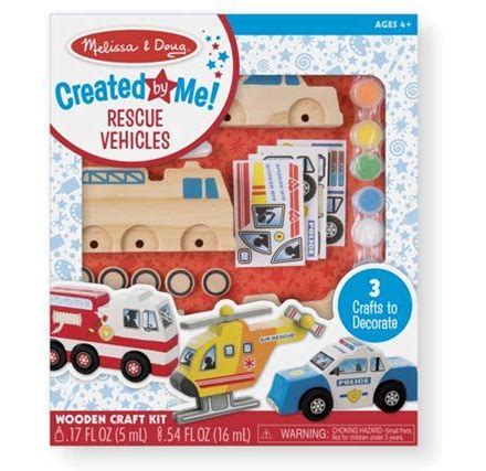Kids can race to save the day with this exciting set of three rescue vehicles--featuring wheels and propellers that really spin! Includes easy-to-assemble wooden police car fire truck and helicopter wheels axles propellers and stands plus 8 pots of paint.