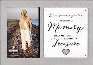 Keep the memory of a loved one close by displaying a favorite photo in this rustic stained wood with laser cutout plaque and pewter accents. Easel back for table top display only. Horizontal frame display with a vertical picture.