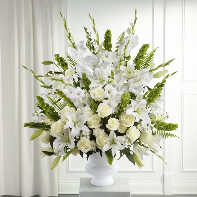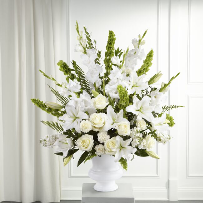 A peaceful and calming arrangement of white flowers, including roses, carnations, and lilies. Accented with green Bells of Ireland and lush foliage, this arrangement offers a serene tribute.