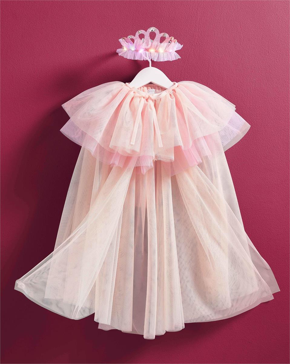 2-piece set. Mesh princess cape comes with light-up tiara headband. One size fits most. Batteries included.