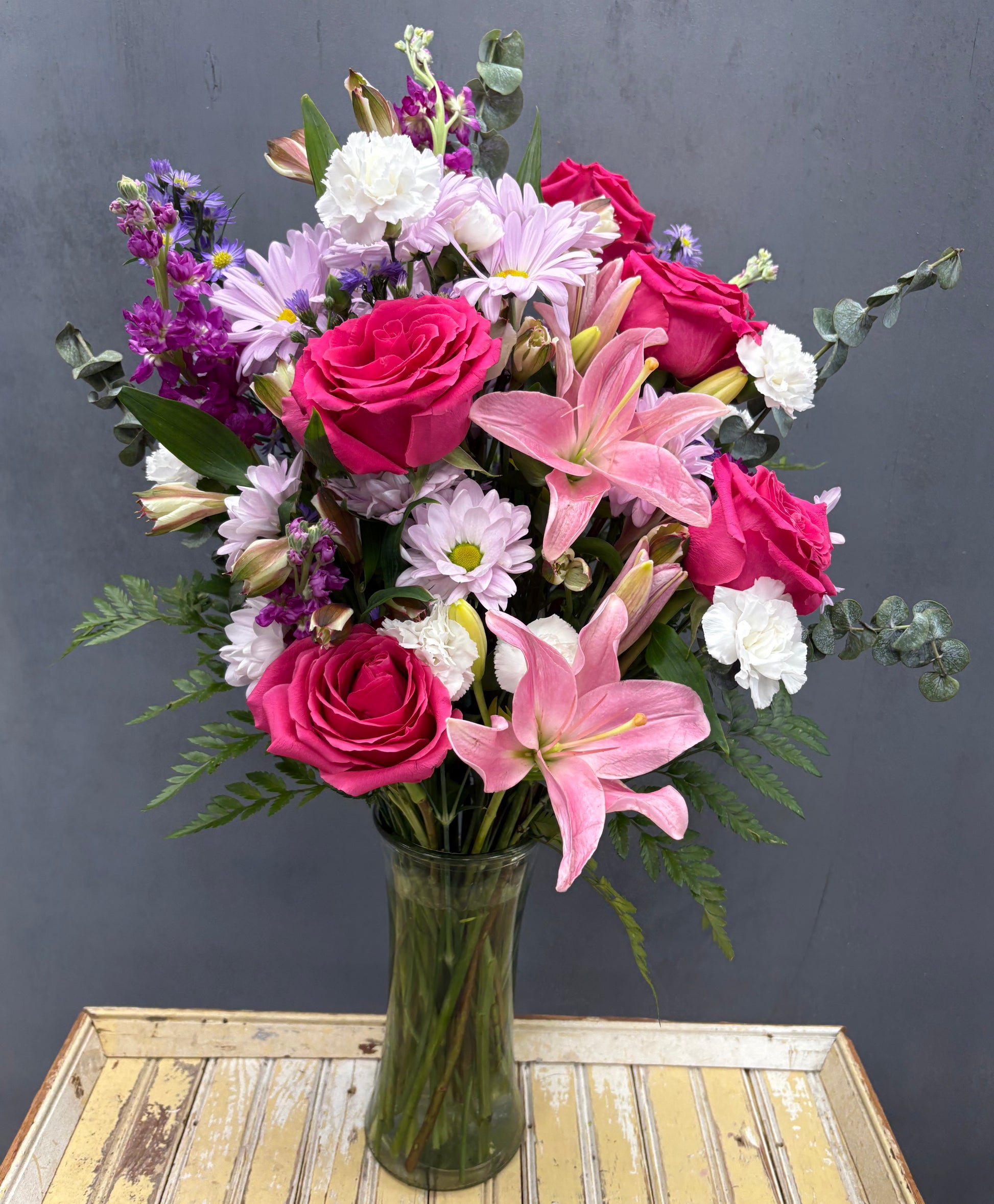Carefully arranged, the alluring mix of roses, lilies, and other fresh flowers is sure to warm a heart and bring a smile to your special someone’s face.