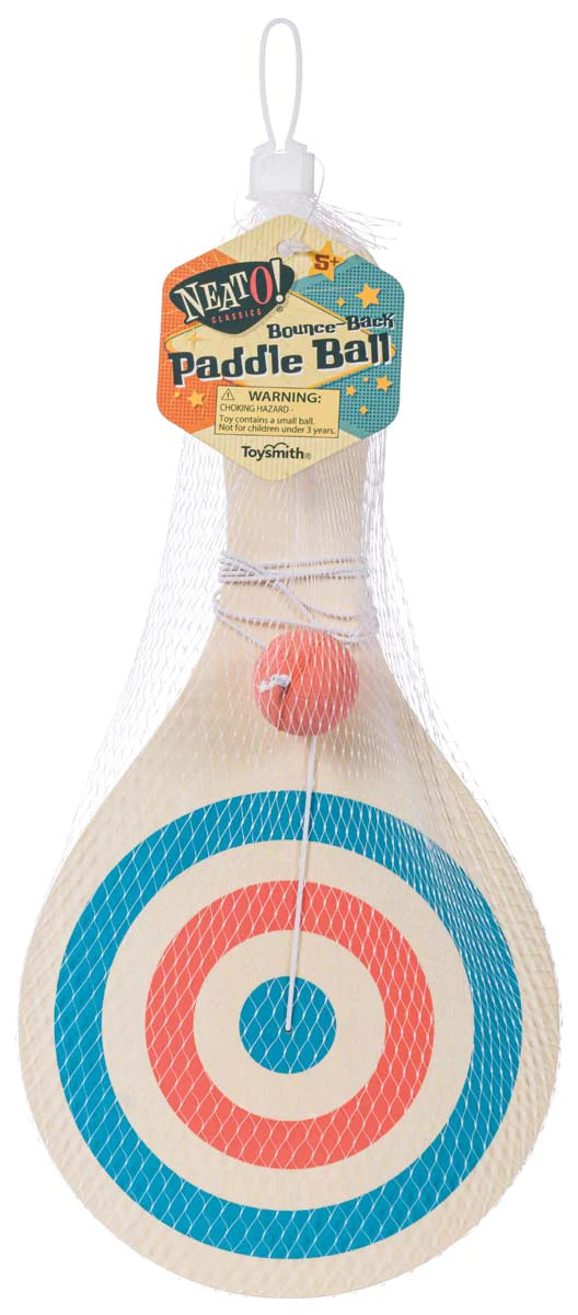 Hit the target on this nostalgic 10 inches wood paddle ball. Packaged in a peggable net bag. Contains latex. 5yrs and up