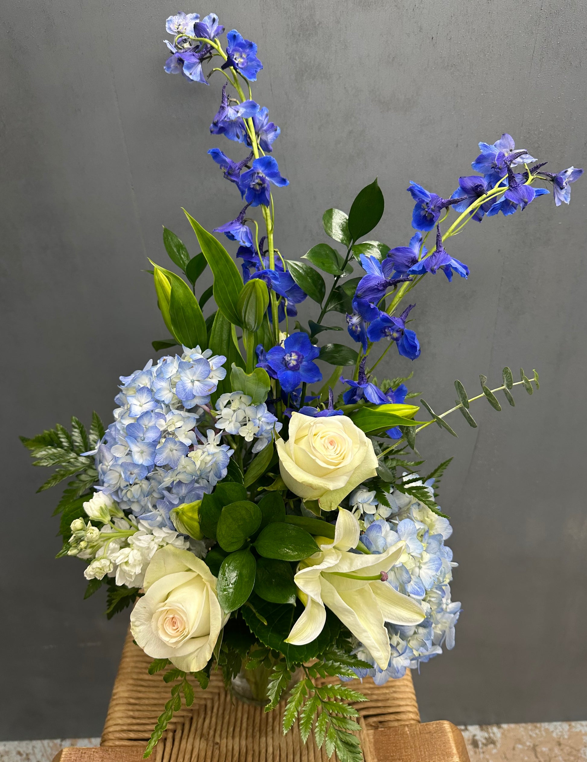 This beautiful mixture of blue and white flowers will bring a feeling of freshness to any space. With roses, hydrangea, and lilies, it has an elegance that would make anyone’s day a bit brighter.