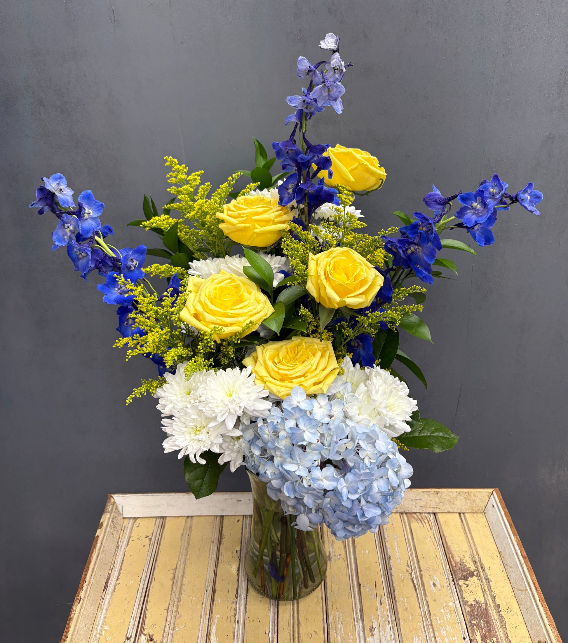A refreshing mix of blue, yellow, and white flowers that bring light and happiness — perfect for brightening someone’s day.