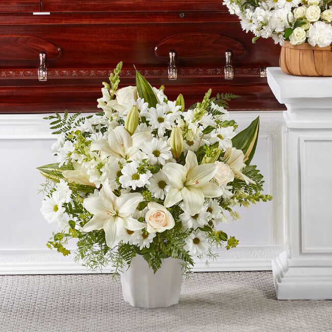 Comfort, beauty and grace come together in this stunning display of serene blooms. Our Thoughts of Tranquility Floor Basket is handcrafted with ivory roses and white hydrangea, snapdragons and lilies to show how much you care.